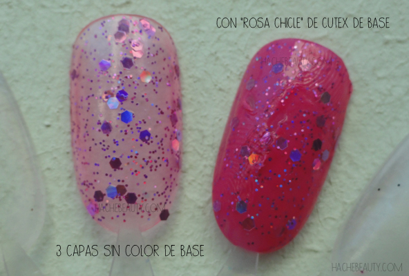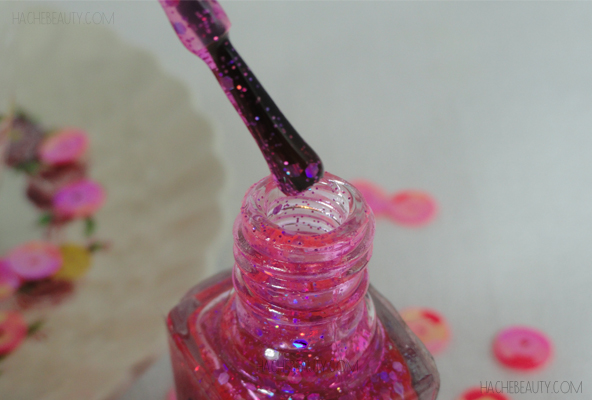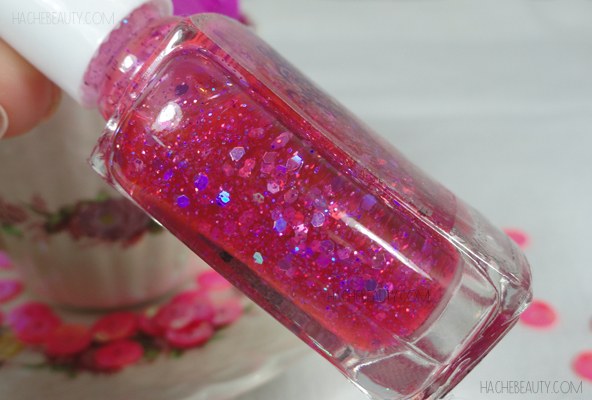 Se trata de un esmalte con una leve base rosada y glitter del mismo tono con algunos plateados (micro y hexagonal). Aplicarlo es sencillo y seca bastante rápido. Tiene buen brillo y no queda tan áspero como otros glitters que probé en mi vida. Se puede usar solo o como top coat, ya que al tener un poquito de color de base queda súper sutil.