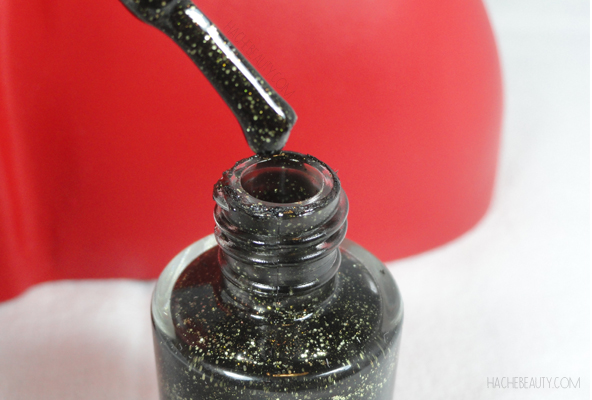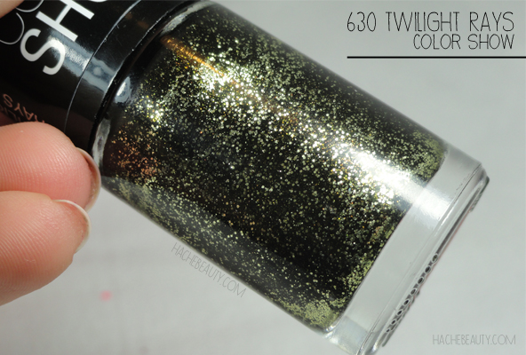 Twilight Rays es hermoso!!! El esmalte tiene base negra cremosa y glitter dorado (mucho!). Por momentos las partículas doradas se ven verdosas, por lo que el esmalte cambia de color según la luz. Ojo! no digo que tenga algún efecto especial, solamente que el dorado con el negro bajo cierta luz…se ve verde.