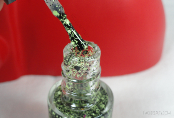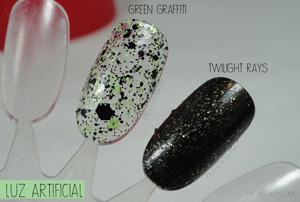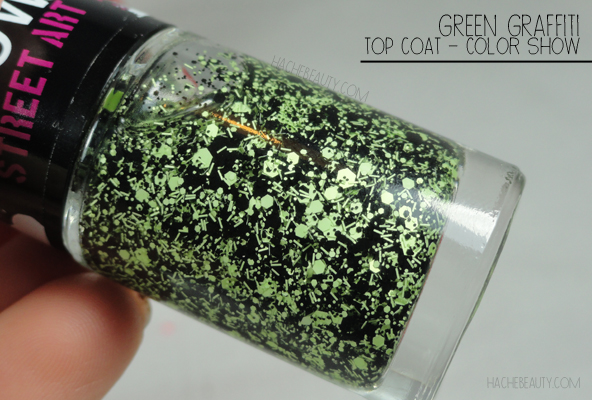 Green Graffiti es un top coat de base transparente con glitters de diferentes formas y tamaños en verde neón y negro. El efecto imita (o intenta) la técnica «splatter«, que consiste en salpicar las uñas con diferentes esmaltes para generar un patrón irregular.