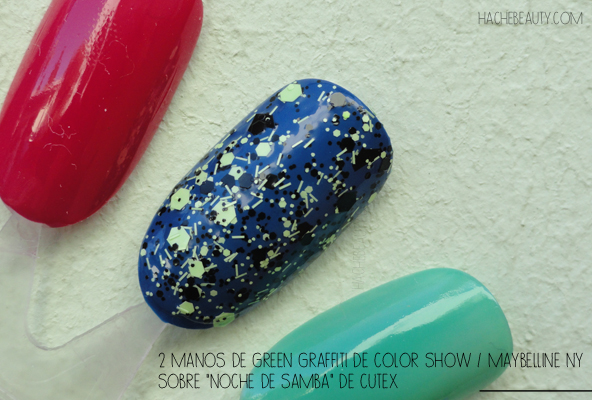 Green Graffiti me sorprendió, aunque reconozco que no sabía muy bien qué esperar. Lo compré cuando estaba de vacaciones y al llegar al hotel lo quise probar enseguida! Al principio no me pareció nada muy espectacular, pero le fui tomando cariño y después de 3 pasadas, me gustó el efecto sobre las uñas. A continuación pueden ver una foto sobre azul, pero vi que también queda lindo sobre negro e incluso rojo, ya que el contraste que genera es interesante. La consistencia es buena, no es muy denso y seca rápido. A veces hay que buscar con el pincel los pedacitos de glitter más grandes pero no me parece algo grave. Con un buen top coat no se siente áspero y queda súper prolijo.