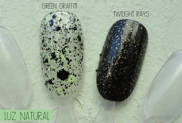 Twilight Rays me asustó al aplicarlo, porque en la primera pasada no tiene buena cobertura (excepto que la hagan muy gruesa, cosa que no recomiendo). Ya la segunda mano mejora muchísimo, logré buena cobertura y el efecto queda muy lindo. Es el tipo de esmaltes que me encanta, porque tiene glitter y es oscuro, así de simple. Si noté un poco ásperas las uñas, pero con un buen top coat se logra mayor brillo y queda bien liso.